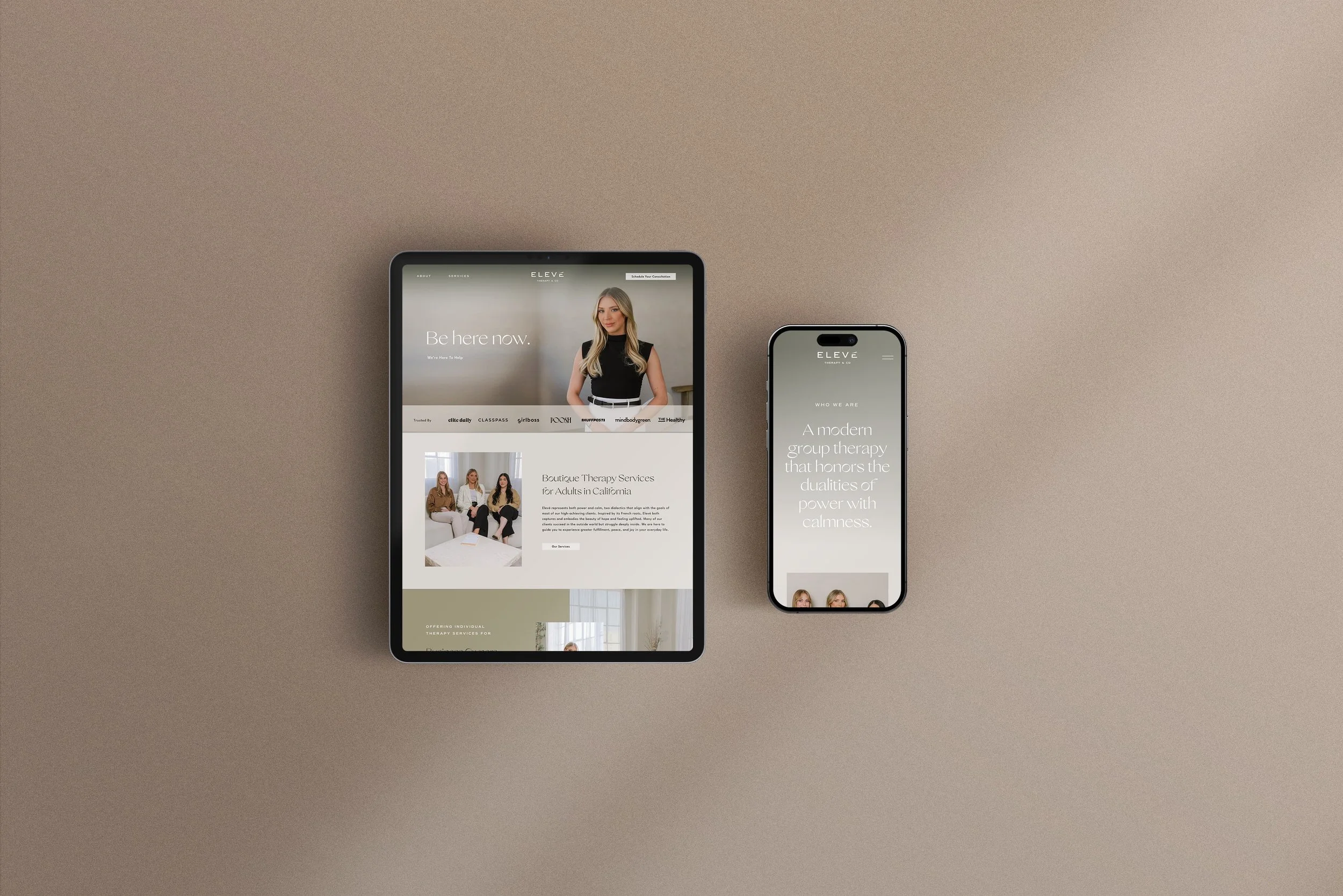We brought this identity to life through a custom Showit website that balances minimalism with depth. Subtle fade-in effects, gradients, and clean layouts make the large amount of content easy to navigate without overwhelming visitors. By combining thoughtful design, strategy, and user experience, we delivered a site that feels elevated yet accessible, standing apart from typical group therapy websites and positioning Élevé Therapy & Co. as a leader in boutique therapy services.